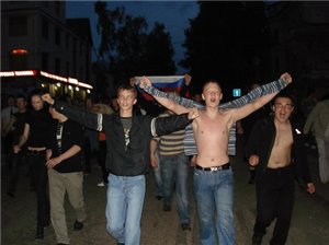 В Сыктывкаре лихо отметили выход сборной России в четвертьфинал чемпионата Европы по футболу. Российские футболисты подарили фанатам праздник 18 июня, выиграв у команды Швеции со счетом 2:0. Перед матчем всеобщий энтузиазм подогревал персонал городских баров и кафе. В центре города из колонок доносилось: «Поддержим Россию! Где же вы, болельщики?!» Поклонников футбола завлекали большими экранами, холодным пивом и горячими шашлыками. Впрочем, болельщики российской сборной и без дополнительных приглашений стекались в места массового просмотра матча. Во многих заведениях все места были забронированы заранее. В «Спортбаре» на центральном стадионе Сыктывкара с началом прямой трансляции из австрийского Инсбрука фанаты начали оживленно комментировать все перипетии, происходящие на экране. Когда на стадионе в Инсбруке началось исполнение национального гимна России, болельщики в спортбаре все как один встали, некоторые пели, хотя хор голосов был нестройным, так как не все еще выучили новые слова гимна. Финальный свисток, возвестивший конец знаменательного для россиян матча, был встречен бурными овациями. Взбудораженные болельщики высыпали на улицы. Массовые гулянья продолжались в центре Сыктывкара всю ночь, несладко пришлось жителям окрестных домов. Фанаты, сигналя, разъезжали на автомобилях и мотоциклах. Распевая песни и выкрикивая речевки, болельщики стекались в центр города, где организовали колонну, и маршем ходили взад-вперед по улице Коммунистической. Некоторые успевали играть при этом в футбол. Сотрудники милиции сопровождали ликующую толпу и пытались ее остановить, когда движение болельщиков перетекало на проезжую часть. На Стефановской площади под аккомпанемент баяна был исполнен государственный гимн. Припев известной песни «Аргентина – Ямайка» группы «Чайф» сыктывкарцы пели на свой лад: «Какая боль! Какая боль! Россия-Швеция 2-0!». «Это была какая-то «варфоломеевская ночь», на улицы вышло до пяти тысяч человек, тогда как после предыдущей победы российских футболистов над греками выходило порядка 500 человек», – сообщили «КомиОнлайну» в УВД Сыктывкара. Экипажи ППС, ГИБДД и вневедомственной охраны дежурили на улицах города до четырех утра – пока болельщики не утихомирились. Ничего из ряда вон выходящего не произошло, однако в УВД поступило много звонков с жалобами на шум от проживающих в этом районе сыктывкарцев, рассказали в отделе пропаганды УВД Сыктывкара. Всего за прошедшую ночь за мелкое хулиганство задержано 10 человек. Тем временем Сыктывкар «засветился» и непосредственно на Евро-2008. Как пишет в своем блоге специальный корреспондент Sports.ru Алексей Шевченко, на матче России с Испанией на одной из трибун болельщики развернули российский флаг с надписью «Сыктывкар». «Наверное, в УЕФА удивились появлению новой провинции в Испании, – предполагает автор блога, указывая, что флаг был расположен в секторе испанских болельщиков. – Совершенно непонятно, как наши умудрились получить проход на их сектор. Это же практически невозможно». Владелец флага – сыктывкарский футбольный болельщик Дмитрий Жилин. Он рассказал «КомиОнлайну», что отдал его друзьям, которые поехали на Евро-2008, причем у них не было билетов на матчи. «Вероятно, они купили билеты у спекулянтов, тем самым объясняется их попадание на трибуну испанск